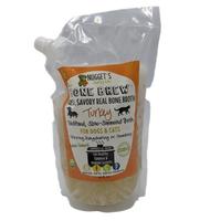 Add savory nutrition to your pet's diet with delicious Turkey Bone Brew from Nugget's Healthy Eats. Broth is perfect as a healthy snack or food topper, adding a boost of protein, amino acids and gelatin to your pet's diet. Nugget's sources proteins from animals humanely raised on organic, open pastures, using only the premium knuckle & marrow bones for the healthiest and tastiest bone broth. Brews are made by slow roasting, then simmering bones for over 30 hours with apple cider vinegar and purified water, then adding ginger and turmeric. Broth is then frozen immediately to retain the nutrition and taste. The result is a delicious broth. Thaw in refrigerator and serve as a snack, or warm slightly for a nourishing drink or food topper to entice picky pets. A delicious way to support your pet's digestion, coat, bone and brain health.