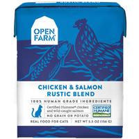 Bring nature's best to your cat's bowl with Open Farm's Chicken & Salmon Rustic Blend. It's made from 100% human-grade ingredients like Ocean Wise approved wild-caught salmon, Certified Humane chicken, and nutrients-rich superfoods such as pumpkin, carrots, and cranberries. There are no grains, potatoes, hormones, or GMOs, and every container is easy to open, reseal, and recycle. Available in 5.5 oz containers. Made in the USA.