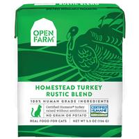 Bring nature's best to your cat's bowl with Open Farm's Homestead Turkey Rustic Blend. It's made from 100% human-grade ingredients sourced from Certified Humane farms, like ground turkey and nutrients-rich superfoods such as pumpkin, carrots, and cranberries. There are no grains, potatoes, hormones, or GMOs, and every container is easy to open, reseal, and recycle. Available in 5.5 oz containers. Made in the USA.