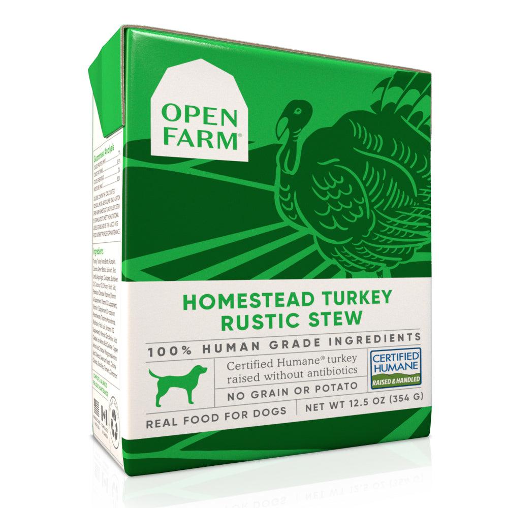 Bring natures best to your dogs bowl with Open Farms Homestead Turkey Rustic Stew. Its made from 100% human-grade ingredients sourced from Certified Humane farms, like ground turkey and nutrients-rich superfoods such as pumpkin, carrots, and green beans. There are no grains, potatoes, hormones, or GMOs, and every container is easy to open, reseal, and recycle. Available in 12.5 oz containers. Made in the USA.
