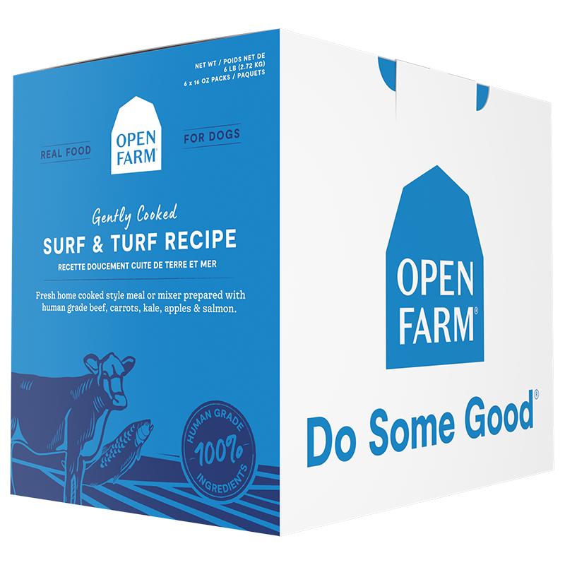 Beef, Beef, Carrots, Kale, Apples, Salmon, Beef Liver, Butternut Squash, Pumpkin, Water, Flaxseed, Coconut Oil, Sunflower Oil, Tricalcium Phosphate, Salt, Potassium Chloride, Choline Chloride, Chia Seeds, Chicory Root. Vitamins (Vitamin A Supplement, Vitamin D3 Supplement, Vitamin E Supplement, D-Calcium Pantothenate, Mononitrate Riboflavin, Folic Acid, Vitamin B12 Supplement), Minerals (Zinc Amino Acid Chelate, Iron Amino Acid Chelate, Copper Amino Acid Chelate, Manganese Amino Acid Chelate, Selenium Yeast), Dried Kelp, Turmeric, CinnamonOpen Farm Surf & Turf Gently Cooked Recipe is formulated to meet the nutritional levels established by the AAFCO dog food nutrient profiles for maintenance.