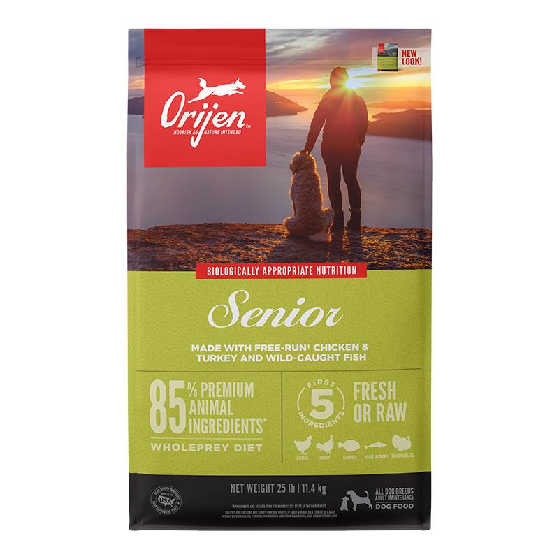 With 85% meat and 15% fruits and veggies, Orijen Senior Dog Formula is a bag full of the healthiest dry kibble for your older dog. As a senior dog, your pup has special needs. Orijen takes this in mind and packs in proteins to replicate a nature diet. This formula also contains free-run chicken and turkey, whole eggs and wild-caught fish. As far as fruits and veggies, the senior dog formula has regional fruits and veggies to limit having too many carbohydrates. This great diet is even grain free. So give your faithful friend what it needs with Orijen Senior Dry Formula!