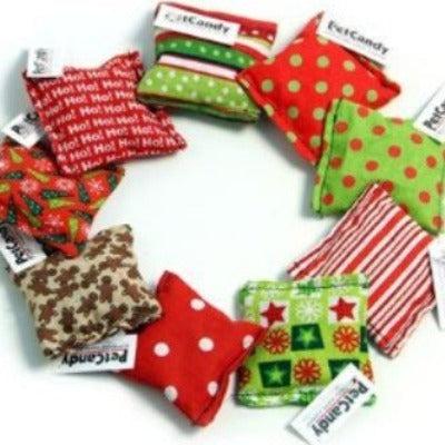 These simply festive pillow-shaped toys are the perfect way to indulge kitty's sweet tooth for catnip! Holiday print 2.5" squares are stuffed with farm fresh USA catnip and are durable enough to hold up to all kinds of batting, kicking, wrestling and licking. You'll receive one Holiday Kittles toy, randomly chosen from our collection of fun assorted holiday patterns.