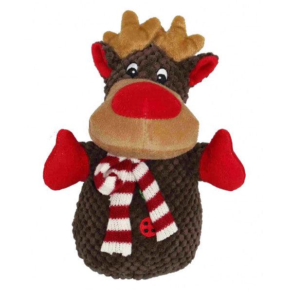 No one is going to miss the nose on this reindeer! With welcoming arms spread wide and mittens and scarf on, this 8" squeaky toy will be a cute addition to your dog's holiday celebration.