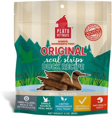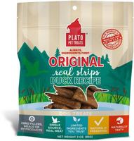 Real meat treats by Plato are sure to have your dog begging for more. These Original Duck Strip treats are made with duck and brown rice. They are soft and easy to chew and can be easily broken for dogs of all sizes. A true delicacy; these treats are air dried in Plato's California kitchen to maintain nutrients and naturally preserved. Give your dog a special treat of naturally tasty duck!