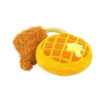 The Chicken and Woofles Plush Dog Toy from P.L.A.Y. is a delicious combination of a golden crinkly waffle with squeaker and a crispy fried chicken leg with it's own squeaker and rope. Adorable and colorful toy made with Eco-friendly PlanetFill® filler, from 100% post-consumer certified-safe recycled plastic bottles. Features AZO-free dyes. Toy is machine washable to keep it fresh longer. This is sure to be a hit with your brunch buddy!