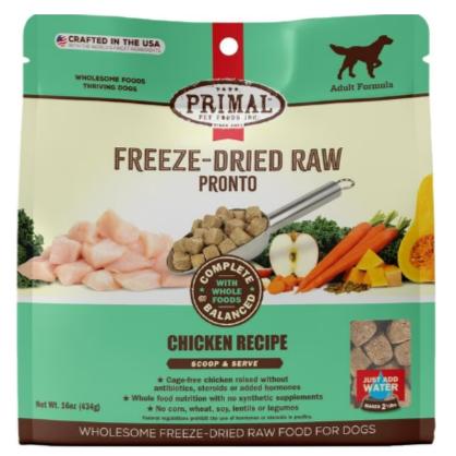 Primal's new Freeze Dried Raw Pronto Chicken Formula for Dogs takes mealtime to the next level! Made in the USA with delicious cage-free chicken and USDA-certified organic produce, this fresh food blend is sure to make your pup's mouth water. Crafted without synthetic vitamins or minerals this highly digestible recipe is designed so that your pooch can absorb as many whole-food nutrients as possible. And, thanks to its shelf-stable, freeze-dried formula, feeding raw food has never been easier. Simply scoop some into your furball's bowl, add some bone broth or goat's milk, and let them chow down! You can even feed it to them dry depending on what they like best. Nutritious and convenient, choosing this wholesome recipe for your furry friend is a no-brainer!