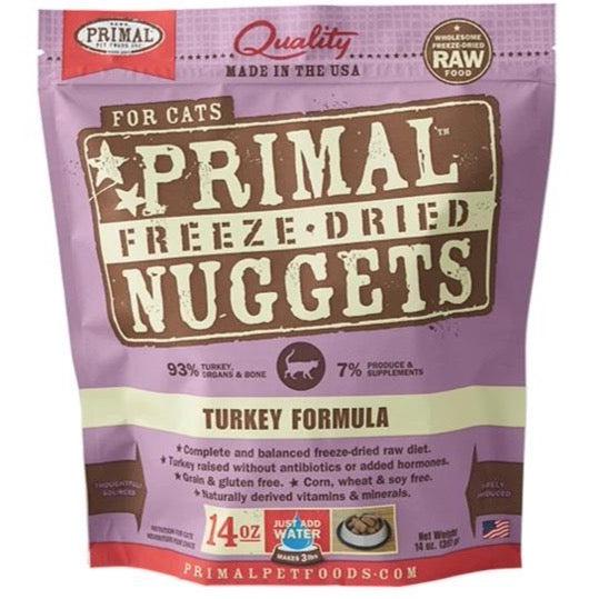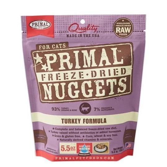 Primal's Feline Raw Freeze-Dried Nuggets Turkey Formula will bring even the pickiest kitties to the bowl. Fresh humanely sourced turkey with organic produce and fish oils provide superior levels of amino and essential fatty acids and natural food-derived vitamins (no synthetics!), with added taurine for optimum retinal health, and finely ground bones for optimum levels of calcium. Easy to feed, simply scoop and rehydrate with water, bone broth or goat's milk for a delicious and satisfying meal your cat will love. Made in USA.