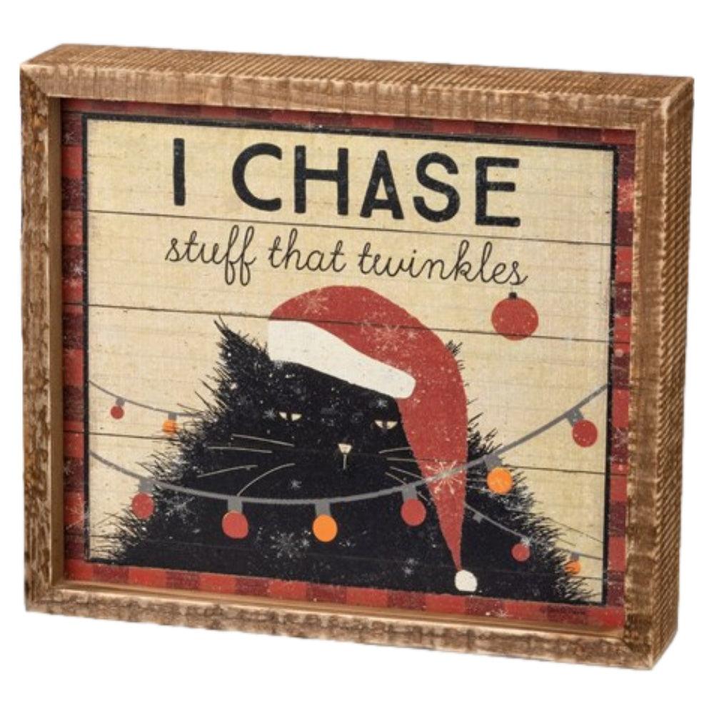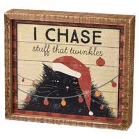 Holiday decorations are irresistible! This festive and fun "I Chase Stuff That Twinkles" rustic wood box sign, from Primitives by Kathy, is the perfect gift for yourself or a fellow feline lover. Easy to hang, or place on shelf or desk. Dimensions: 8 x 7 x 1.75.