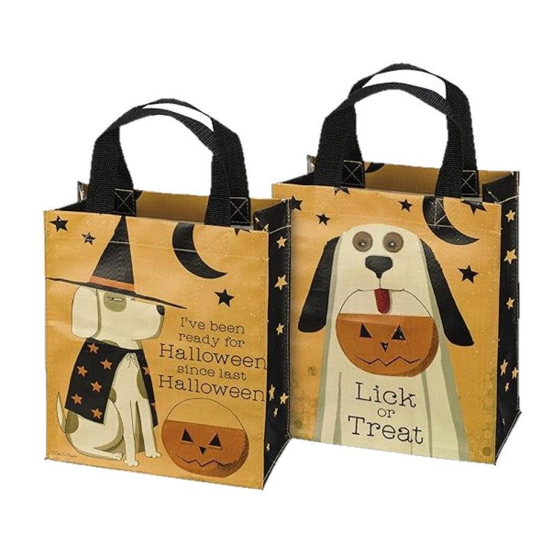 Put yourself in the Halloween spirit with the Double-Sided Halloween Tote from Primitives by Kathy! Decorated with a dreadful duo of dogs who're ready for some treats, one side reads "I've been ready for Halloween since last Halloween" and the other reads "Lick or Treat". A perfect bag for some spooky shopping, this adorable tote also makes an amazing trick-or-treat bag! Whether you plan to fill it with groceries or Halloween candy, treat yourself to this terrifying tote!