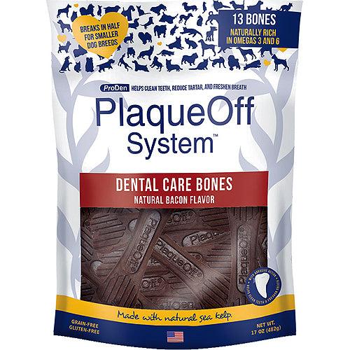 Savory and delicious treat with dental benefits! ProDen PlaqueOff System Dog Dental Care Bones Bacon Flavor are delicious dental care chews your dog will love. Natural sea kelp and algae help clean teeth, reduce tartar and freshen breath and added flaxseeds provide omega 3 and 6 fatty acids for overall health. 100% natural with no gluten, wheat, corn, soy, artificial flavors, colors or preservatives.
