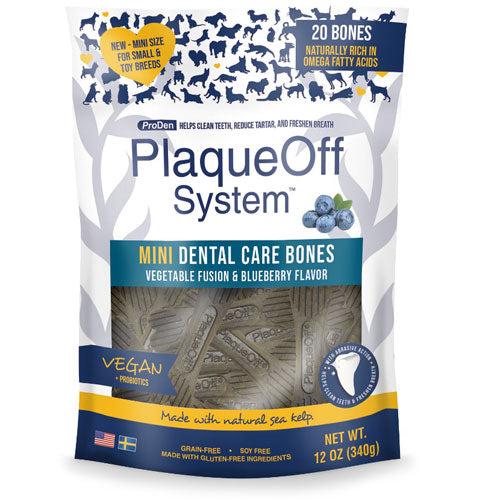 Dental support in a tasty treat! ProDen PlaqueOff Mini Dental Bones - Vegetable Fusion & Blueberry Flavor are delicious dental care treats your dog will love. Natural sea kelp and algae help clean teeth, reduce tartar and freshen breath and added flaxseeds provide omega 3 and 6 fatty acids for overall health. 100% natural with no gluten, wheat, corn, soy, artificial flavors, colors or preservatives.