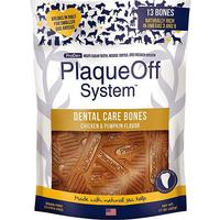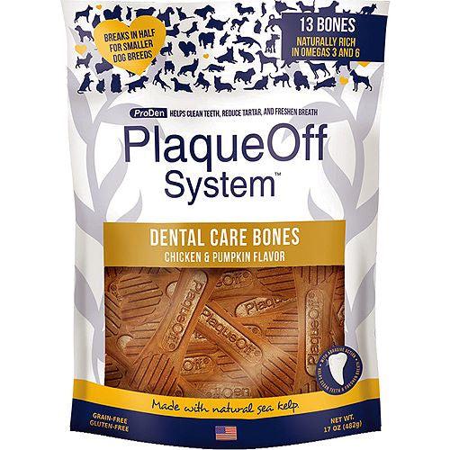 Dental care the tasty way! ProDen PlaqueOff System Dog Dental Care Bones - Chicken & Pumpkin Flavor are delicious dental care treats your dog will love. Natural sea kelp and algae help clean teeth, reduce tartar and freshen breath and added flaxseeds provide omega 3 and 6 fatty acids for overall health. 100% natural with no gluten, wheat, corn, soy, artificial flavors, colors or preservatives.