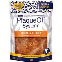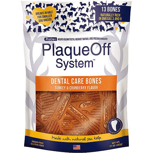 Treat time with benefits! ProDen PlaqueOff System Dog Dental Care Bones Turkey & Cranberry Flavor are delicious dental care treats your dog will love. Natural sea kelp and algae help clean teeth, reduce tartar and freshen breath and added flaxseeds provide omega 3 and 6 fatty acids for overall health. 100% natural with no gluten, wheat, corn, soy, artificial flavors, colors or preservatives. Net wt. 17 oz. Made in the USA.