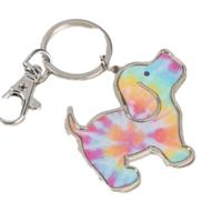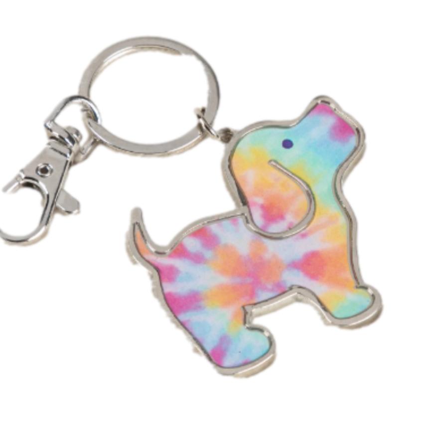 Add some vibrance to your key chain with Puppie Love's Tie Dye Pup Key Ring! This bright and vivid puppy shaped key ring is as colorful as it is cute! Perfect for brightening up your key chain, backpacks, lanyards and more. This key ring makes an adorable gift, and it features a silver finish with clear expoxy design. Measures 2.5" x 1.5".