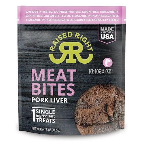 Who says treats have to be junk food? With Raised Right Meat Bites Pork Liver treats, you can spoil your furry friends with an indulgent, protein-packed snack! Every last yummy bite is made from one ingredient and one ingredient only - rich, meaty pork liver sourced from the USA! They're minimally processed which preserves the flavor and nutritional value, and completely human-grade so you know your pet is getting only the best of the best! Great for both cats and dogs. Feed as a special reward or break into small pieces to use as a training treat! Made in the USA. Net wt. 5 oz.