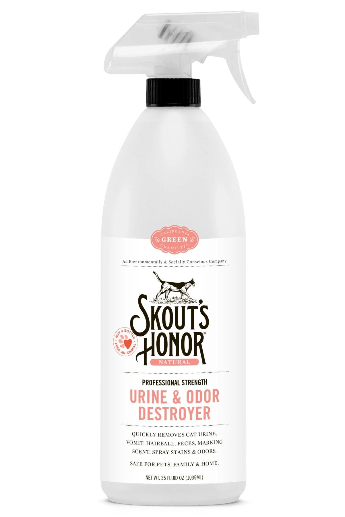 The Cat Urine & Odor Destroyer from Skout's Honor with Biokore technology tackles pet odors at the molecular level, leaving your home cleaner and fresher. Removes stains and odors from cat urine, feces, marking scent, spray stains, vomit, hairballs & more. This is not an odor cover-up, it's a true odor eliminator. 35 fl. oz.