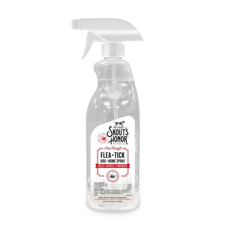 New from Skout's Honor, Flea+Tick Dog & Home Spray is an effective and convenient tool to aid in keeping pesky insects away. Contains natural and potent pest-fighting ingredients that kill and prevent fleas and ticks, and repels mosquitos on your dog and in your home. Fresh peppermint/cedarwood scent. 28 fl oz. Made in the USA.