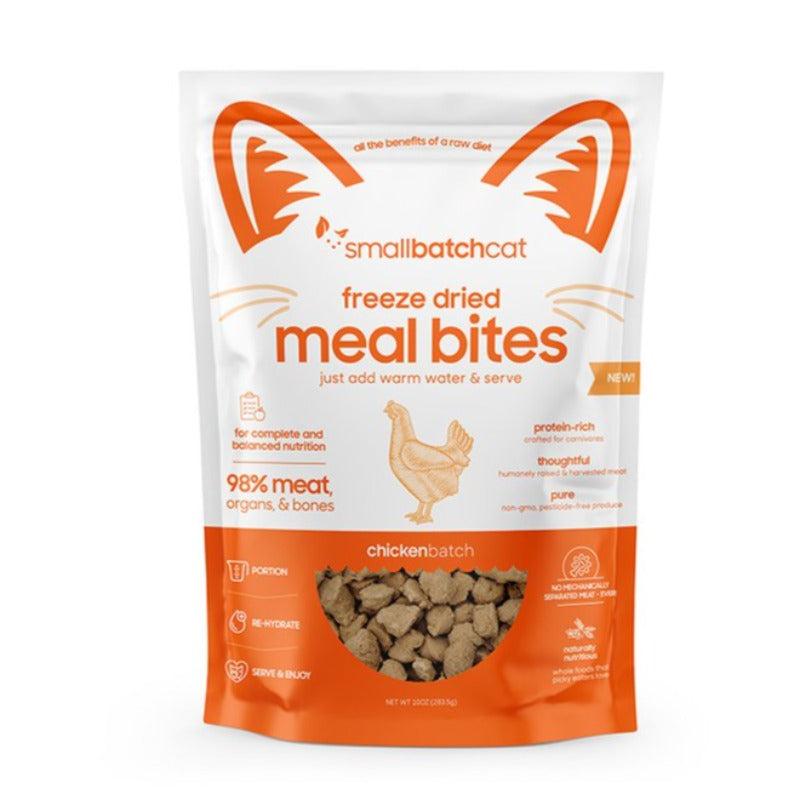 SmallBatch Chicken Freeze-Dried Meal Bites Cat Food is taking meal time to a whole new level! Carefully crafted in the USA with 98% meat, organs, and bones, this wholesome recipe is perfect for your little carnivore. To feed, simply add water, goat's milk, or bone broth to this freeze-dried food for a naturally nutritious meal your cat will adore. You can even mix some of these meal bites into your kitty's favorite wet or dry food for a healthy boost. Delicious from start to finish, your feline friend will be licking their bowl clean every time!