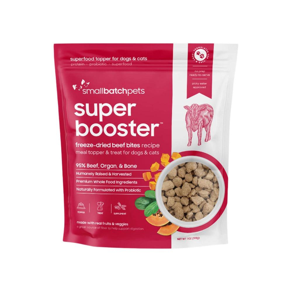 Small Batch Freeze Dried Super Booster Beef Bites is a single source protein treat for dogs and cats. Natural, humanely raised and harvested protein sources, hormone and antibiotic free. Organic, non-GMO, and no synthetics. 95% meat, organ and bone and superfoods combine for a great addition to mealtime or a super healthy treat your pet will love!