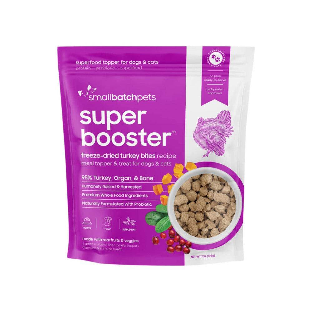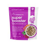 Small Batch Freeze Dried Super Booster Turkey Bites is a single source protein treat for dogs and cats. Natural, humanely raised and harvested protein sources, hormone and antibiotic free. Organic, non-GMO, and no synthetics. 95% meat, organ and bone and superfoods combine for a great addition to mealtime or a super healthy treat your pet will love!