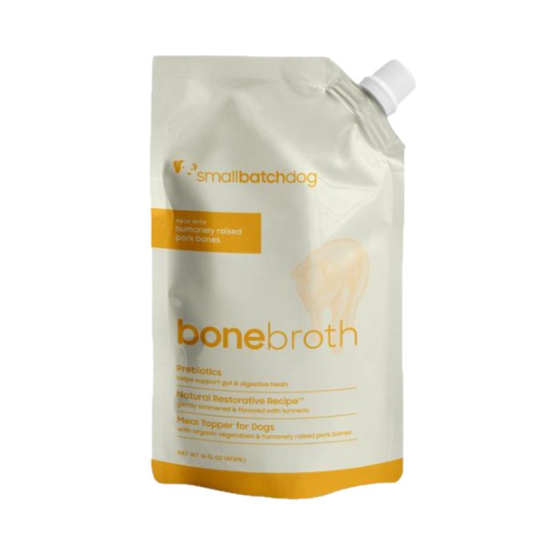 Enhance your dog's dinner bowl with Smallbatch Pets' Humanely Raised Pork Bone Broth! Carefully crafted with ingredients like high quality pork bone, organic vegetables and herbs to help support cellular health and inflammatory balance. This broth is an ideal supplement for your pet's GI tract and joints. Perfect as a meal topper or a treat, your pup will love the added flavors of lemon and apple cider vinegar in this nutritiously hydrating broth. 16 fl oz pouch. Made in the U.S.A.