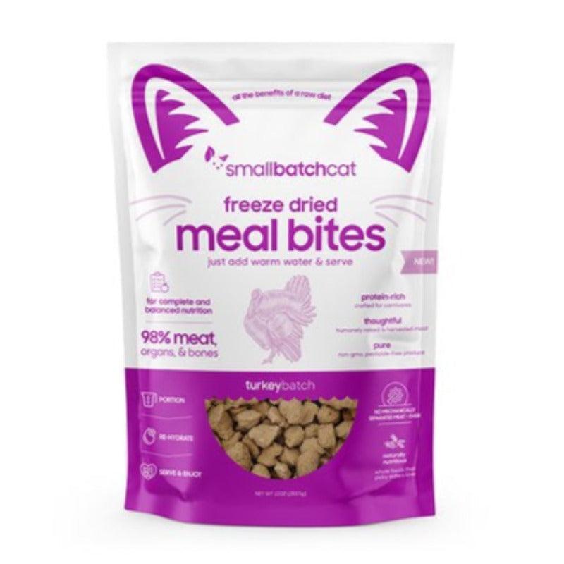 Even the finickiest of felines can't resist the Turkey Freeze-Dried Meal Bites Cat Food from SmallBatch! Made in the USA with 98% meat, organs, and bones, this naturally nutritious food will leave your kitty feeling satisfied. Since this delicious recipe is a complete and balanced meal, all you need to do is add water, goat's milk, or bone broth and serve! You can even mix some meal bites into your kitty's favorite wet or dry food for a healthy boost to their bowl. A wholesome option for your furball, this freeze-dried food is whisker-licking good!