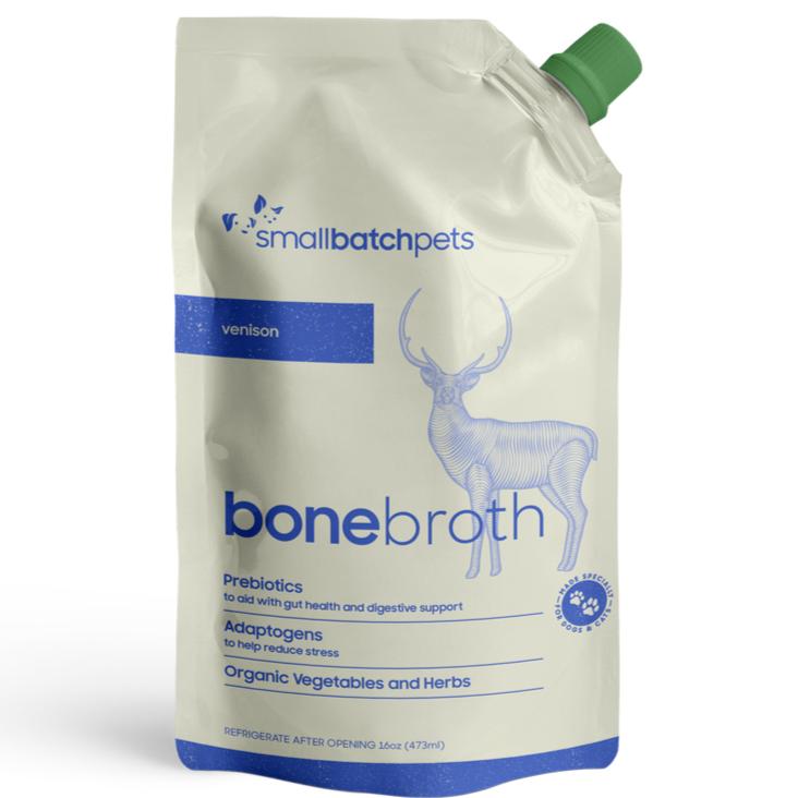 Spice up your pet's mealtime routine with the Venison Bone Broth by Smallbatch Pets! A uniquely crafted shelf-stable bone broth for both dogs and cats, this topper is made with high-quality, humanely-raised venison. Add to that prebiotics for gut and immune health and adaptogens to reduce cellular stress and you've got a recipe for a delicious and nutritious topper. Perfect for pets who need a little extra hydration, joint support, or flavor during mealtime, this versatile topper can be poured over kibble, used to rehydrate freeze-dried or dehydrated food, or poured into a bowl as a yummy drink. Your pet won't be able to get enough of this healthy bone broth topper!