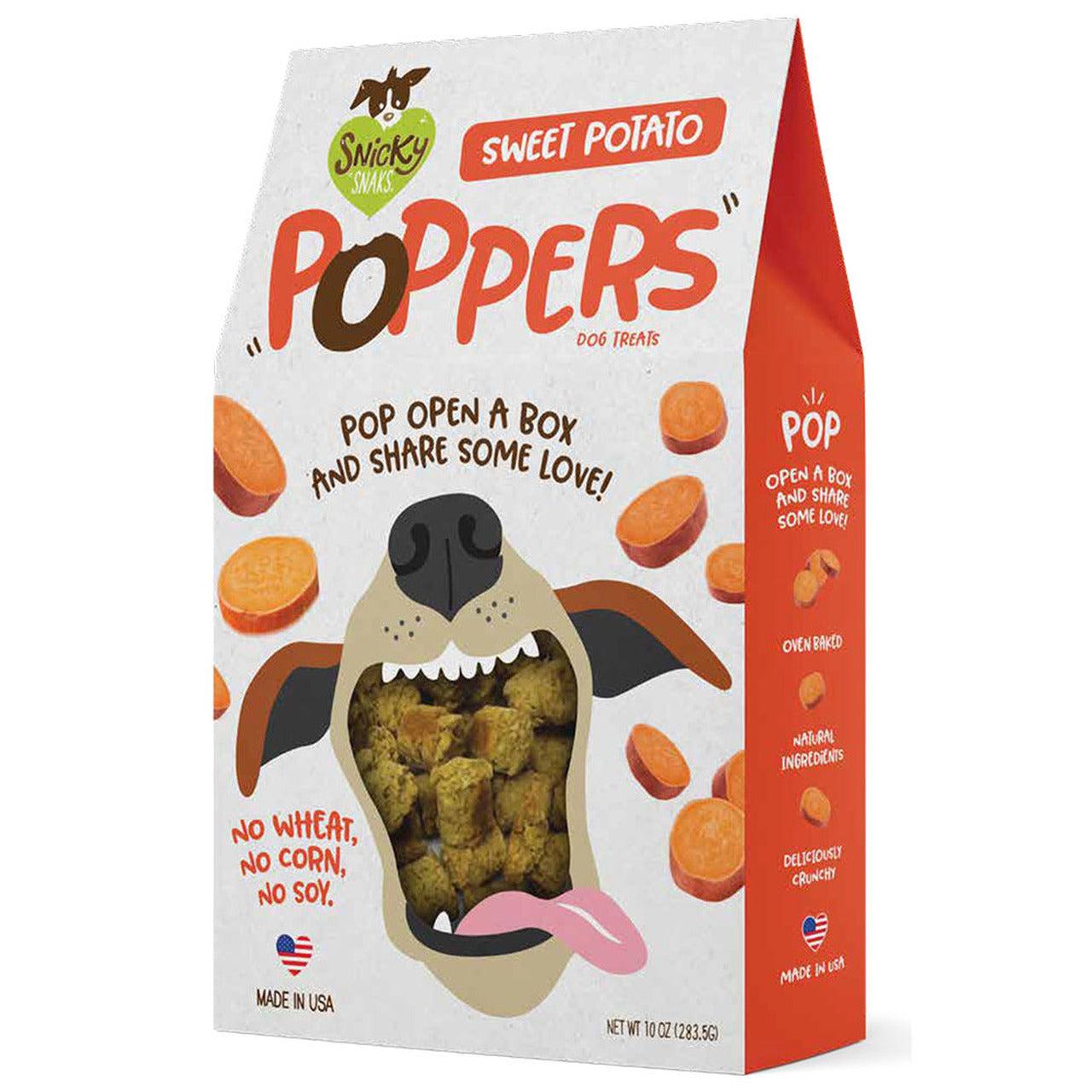 Pop open a pack of these Sweet Potato Poppers from Snicky Snacks for your favorite pooch! Made with natural ingredients, these crunchy bite-sized noms are perfect for everyday treats and treat dispensing toys. Your dog will love them. Net wt. 10 oz