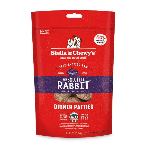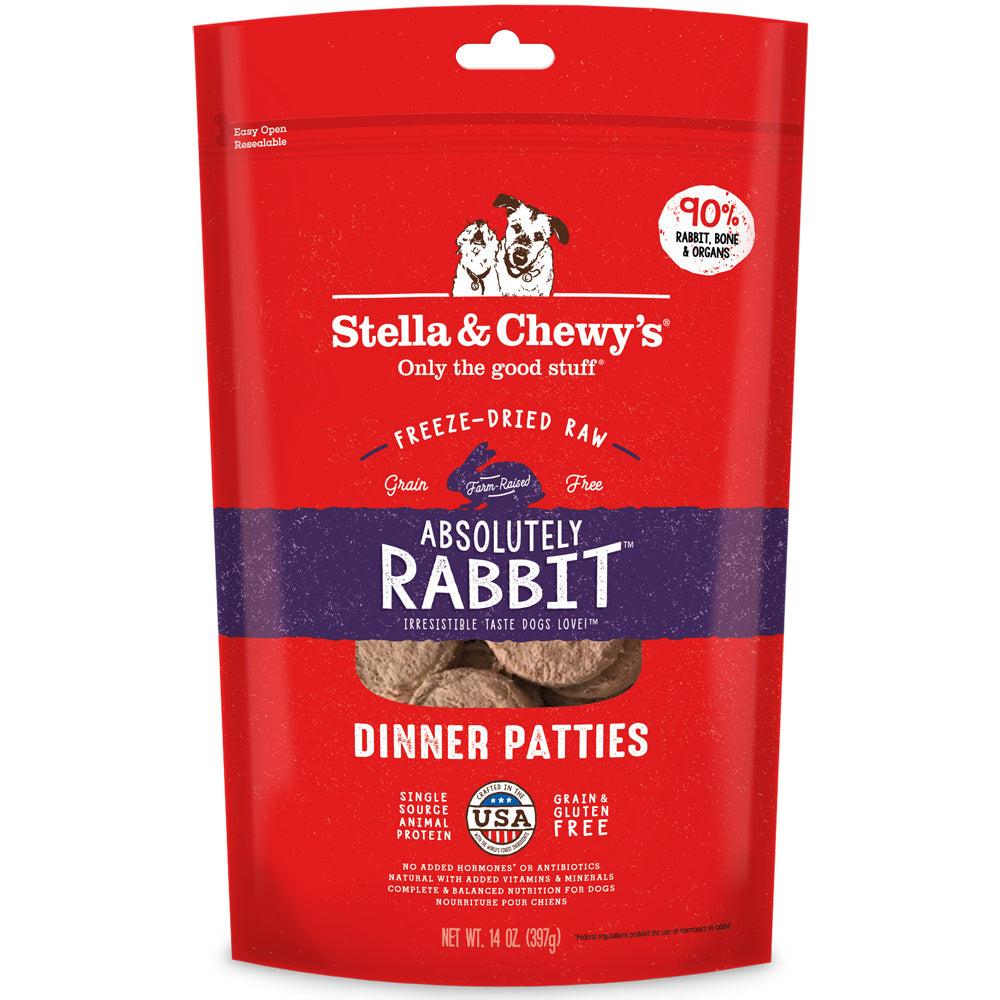 Your dog will be absolutely enamored with Absolutely Rabbit Freeze Dried Dinner Patties by Stella and Chewy's. This premium freeze dried food is formulated to meet the nutritional levels created by the AAFCO Dog Food Nutrient Profiles for all ages and sized breeds. It's a delicious and nourishing dinner with high-quality rabbit protein that will leave them hopping for more.