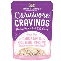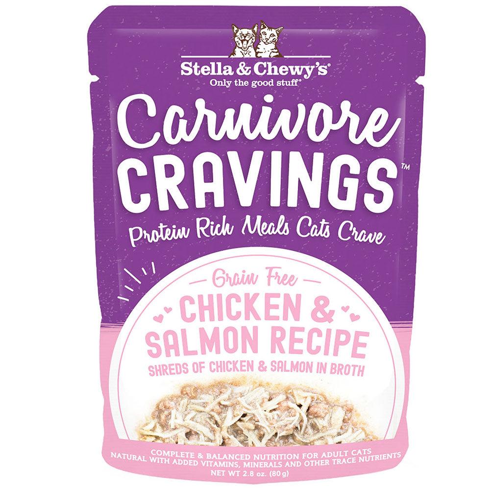 Your cat will be purring for more when it gets the taste of the real shredded wild caught fish and cage free chicken in Carnivore Cravings Chicken and Salmon. This protein and moisture rich diet is perfect as a complete and balanced meal or as a kibble topper. Carnivore Cravings is grain free, legume-free and potato-free. No carrageenan or MSG are used. Add this quality protein for a vibrant and healthy cat.