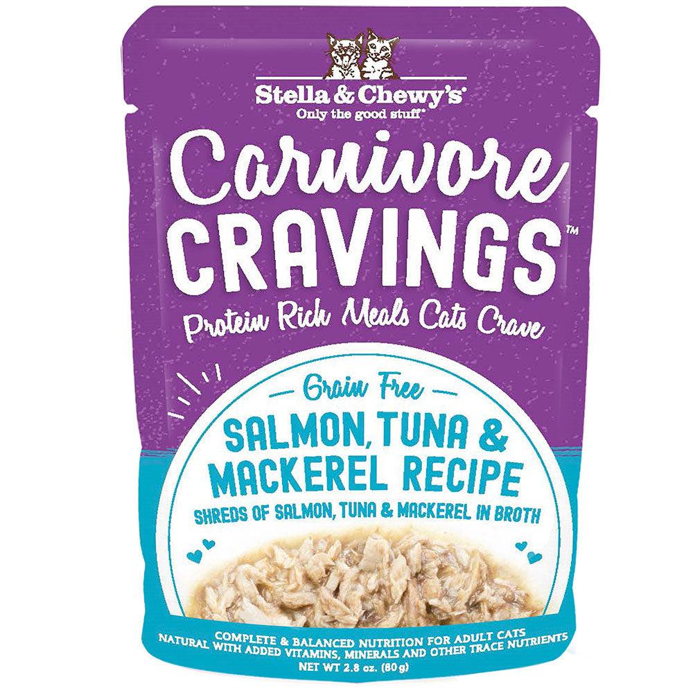 Your cat will be purring for more when it gets the taste of the real shredded wild caught fish in Carnivore Cravings Salmon Tuna and Mackerel. This protein and moisture rich diet is perfect as a complete and balanced meal or as a kibble topper. Carnivore Cravings is grain free, legume-free and potato-free. No carrageenan or MSG are used. Add this quality protein for a vibrant and healthy cat.