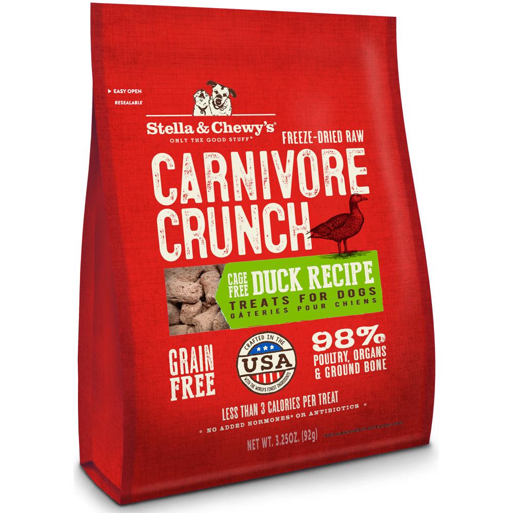 You know its fresh when it has that CRUNCH like Stella and Chewy's Carnivore Crunch Freeze-Dried Duck Treats! These great freeze-dried dog treats contain no artificial flavoring, colorings, dyes, sugar or salt. Carnivore Crunch Free-Dried Duck Treats are perfect for training and can be broken apart and sprinkled on top of dog food to add an extra flavor. So add a little crunch to treat time with the Carnivore Crunch Freeze-Dried Duck Treats! 3.25 Oz bag