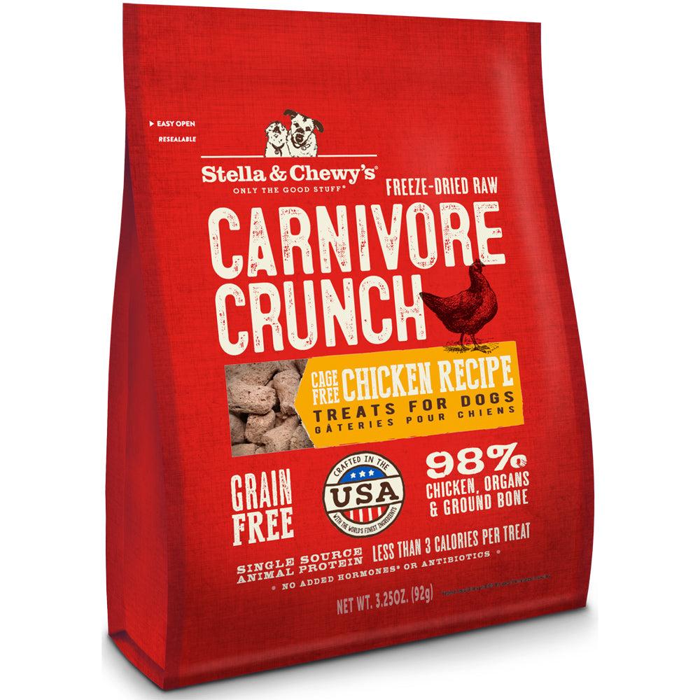 You know its fresh when it has that CRUNCH like Stella and Chewy's Carnivore Crunch Freeze-Dried Chicken Treats! These great freeze-dried dog treats contain no artificial flavoring, colorings, dyes, sugar or salt. Carnivore Crunch Free-Dried Chicken Treats are perfect for training and can be broken apart and sprinkled on top of dog food to add an extra flavor. So add a little crunch to treat time with the Carnivore Crunch Freeze-Dried Chicken Treats! 3.25 Oz bag