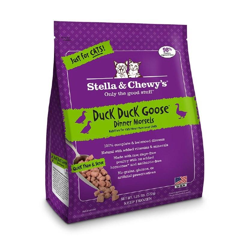 Temptingly savory and delicious, Duck Duck Goose Frozen Raw Dinner Morsels from Stella & Chewy's is sure to entice the finickiest felines! Formulated with 98% raw, cage-free poultry, organs & bone and fortified with taurine, probiotics, vitamins and minerals this complete and balanced recipe is a highly nutritious meal your cat will love. No added hormones or antibiotics, no grains, gluten, fillers, artificial preservatives or colorings. Net wt. 1.25 lb. Made in the USA.