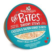 Especially formulated for small dogs, Lil' Bites Savory Stews Chicken & Salmon Dinner in Broth from Stella & Chewy's is a hearty meal your dog will love! Delicious protein-rich, complete and balanced meal is specially formulated for small breed dogs with added turmeric, sunflower and salmon oil, and taurine for anti-inflammatory, skin & coat, and heart health support. No grains, legumes, potatoes, carrageenan, wheat, meal by-products, soy, artificial colors, preservatives or flavors. Big taste and nutrition for small dogs! Convenient 2.7 oz cup.