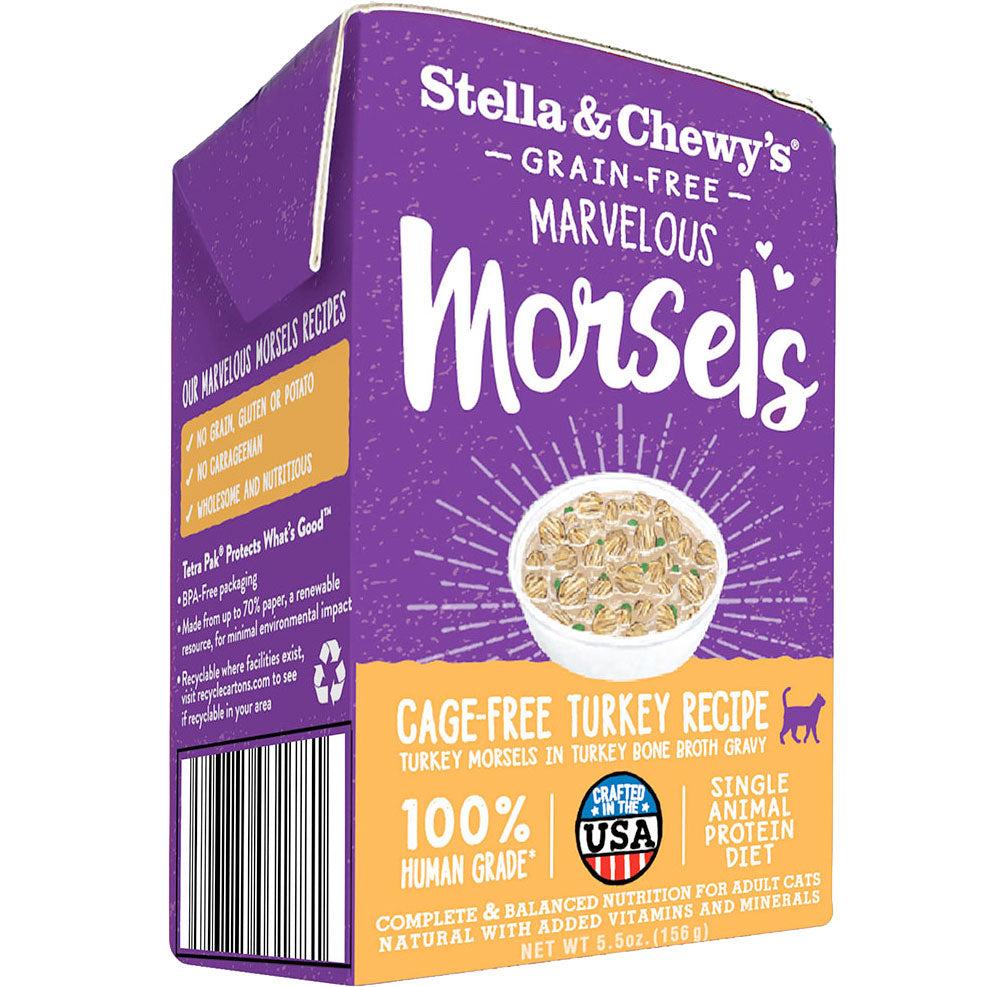 Marvelous Morsels Cage-Free Turkey Recipe Wet Food for Cats by Stella & Chewy's is a tasty recipe featuring cage-free turkey muscle meat, bone broth, and organic fresh-cut vegetables, with added essential amino acid Taurine. No peas, lentils, potatoes, grains, gluten, carrageenan or BPAs. Just natural wholesome goodness your feline friend craves. Use as a complete and balanced meal or as a topper. Crafted in the USA in human food grade facility. Comes in 5.5 oz container.