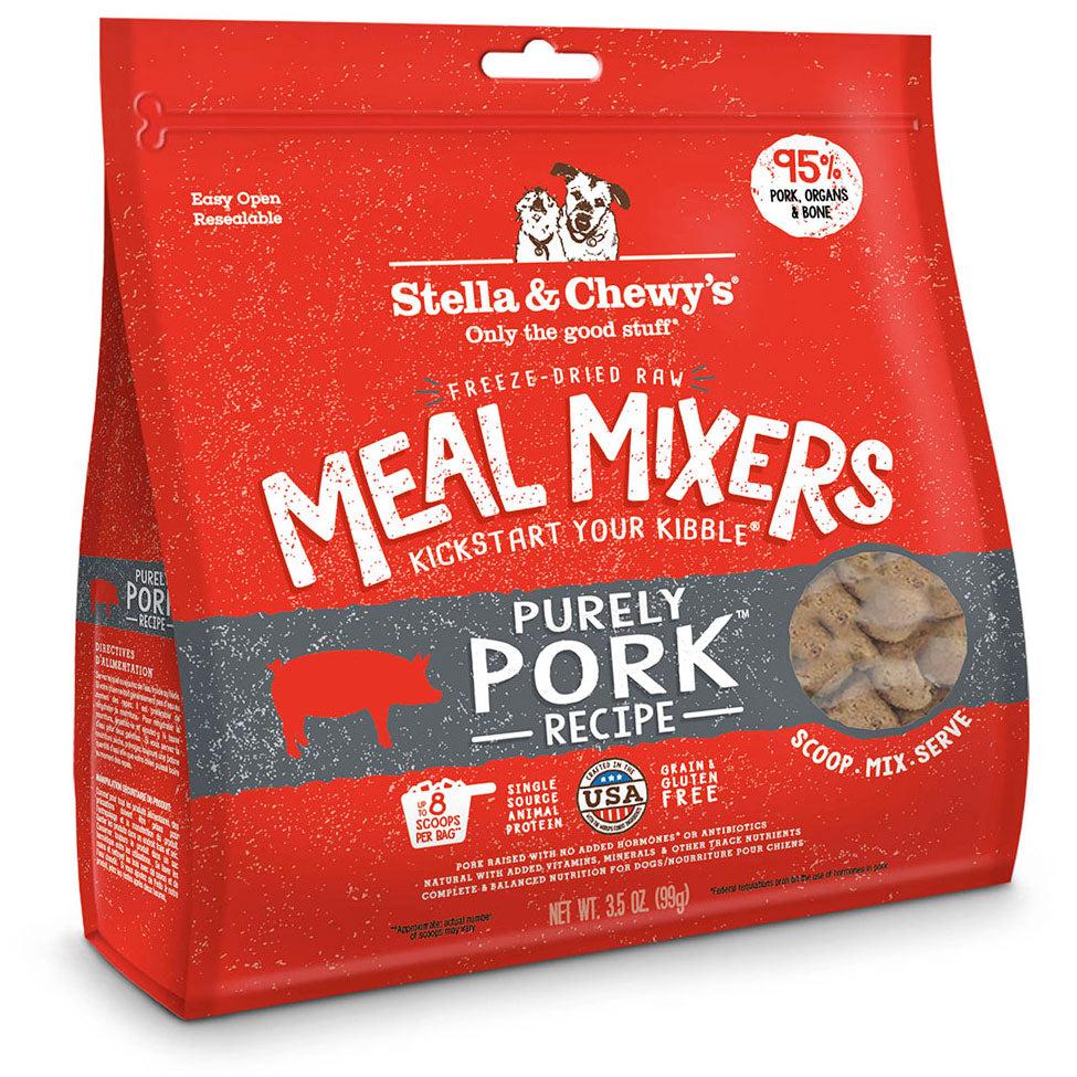 Stella and Chewy's Freeze Dried Purely Pork Meal Mixers is a delicious food topper dogs cannot resist! Made with 95% organ, meat, and bone, the carnivore in your dog will love these meaty morsels! It can be fed as a treat or put on as a topper to enhance any diet. This formula is pea free, lentil free, and potato free. Taurine is added to each bag of meal mixers because it is an essential amino acid that supplies support to your dog's cardiovascular system. Pork is a great protein to try if your dog has allergies. It is a neutral protein, not hot or cold, and easily digestible! This line is perfect to rotate through so your dog is getting a well-rounded diet and doesn't get picky!