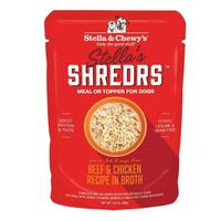 Bring outstanding savory taste and nutrition to the table with Stella's Shredrs Beef & Chicken Recipe in Broth from Stella & Chewy's! Delicious protein-rich recipe can be served as a complete and balanced meal or as a tasty nutrition-boosting topper for your dog's regular food. With only 4-6 simple, wholesome ingredients with added taurine for healthy heart support. No grains, legumes, potatoes, carrageenan, wheat, meal by-products, soy, artificial colors, preservatives or flavors. Convenient 2.8 oz pouch.