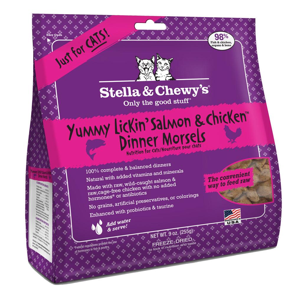 Your carnivore cat will love the meat packed into Stella and Chewy's Yummy Lickin' Salmon and Chicken for cats! This great freeze-dried recipe contains raw, cage free, farm raised chicken combined with natural, wild Alaskan salmon. Your cat will love the grain, hormone, antibiotic, and coloring free recipe. Stella and Chewy's Yummy Lickin' Salmon and Chicken for cats makes sure all meat has been USDA inspected and then freeze-dried to preserve nutrition and flavor. So feed your feline some fish and fowl with Stella and Chewy's Yummy Lickin' Salmon and Chicken!