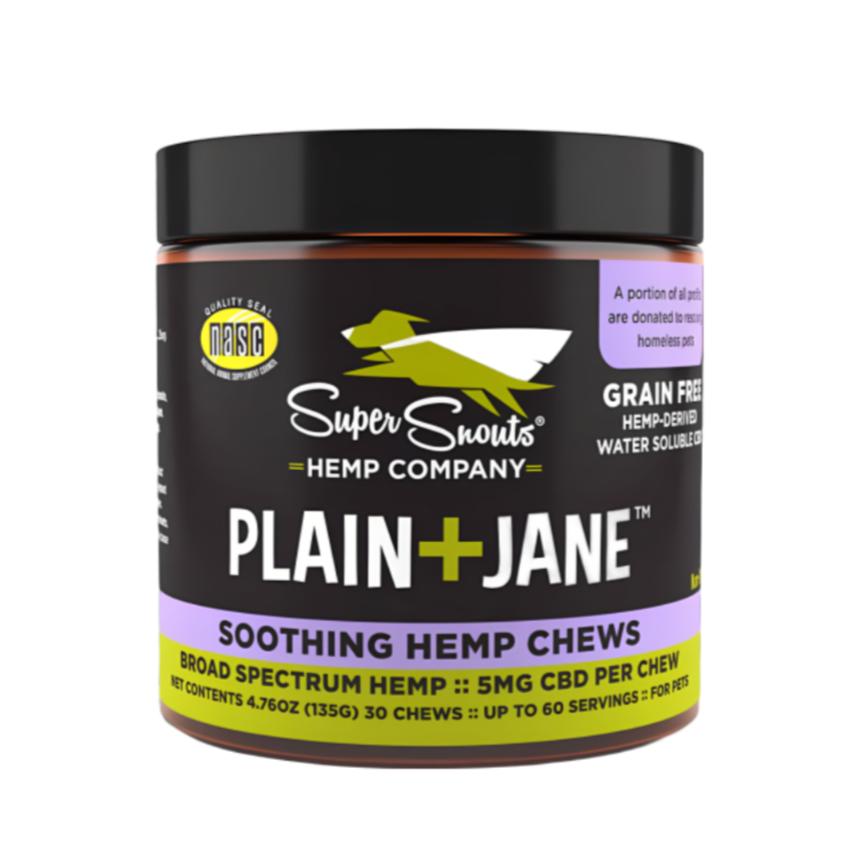 PLAIN+JANE by Super Snouts are the PCR chews that make your pets feel good; plain and simple. What does that mean, exactly? It means your furry family members are getting every benefit the hemp plant has to offer, without the toxic THC, in the convenience of a tasty, full spectrum chew. With PLAIN+JANE, your pet can find relief from pain caused by inflammation, arthritis, or aching joints. It also assists with anxiety, sleep, appetite, skin and coat health, eye and brain health, and so much more. Veterinarian formulated, this product is a natural alternative to otherwise harsh medications.