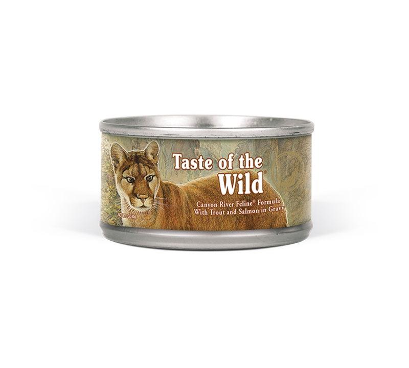 Canyon River Feline Formula from Taste of The Wild is a savory and delicious trout and salmon recipe your cat will love. Wet food is an excellent way to add extra moisture to your cat's diet as either a topper or a complete meal. Rich in protein, with added fruits and veggies for antioxidants and digestion support. Stock up, your kitty's going to love it! Net wt. 3.0 oz.