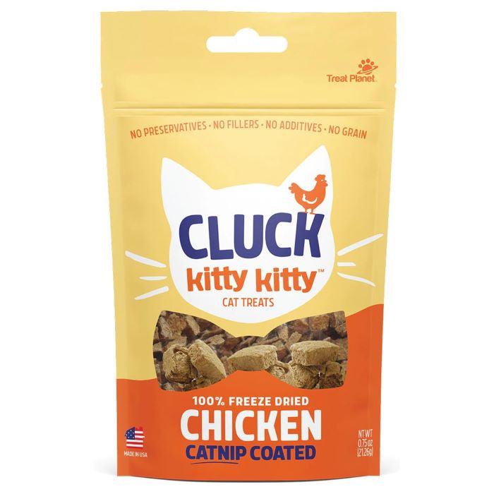Chicken and catnip combine for a delicious and stimulating treat your finicky feline will love. Cluck Kitty Kitty Chicken Catnip Coated Freeze Dried Cat Treats are super healthy limited ingredient treats made with 100% freeze dried chicken and coated in kitty favorite catnip. Treats contain no preservatives, fillers, additives, or grains. Natural and healthy, these are eco-friendly pet treats from Treat Planet are made in the USA. Net wt 0.75 oz.
