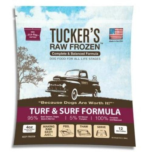Tucker's Raw Turf & Surf Formula is a high multi-protein, complete, and balanced raw diet for dogs. Featuring beef, salmon, beef organ, and pumpkin, this recipe is a healthy, delicious, natural diet for your dog. A simple carnivore diet with pumpkin is easily digested by your pup. Patties are individually vacuum sealed for freshness and ease in handling. All meats are sourced exclusively from the USA, and foods are handmade and packed with pride in Wisconsin.