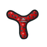Just when you thought all was lost, Tuffy's hold their own against your canine's jaws of fury! Great for interactive play with one or multiple dogs. It can be used as a Frisbee or a tug toy on land or even in the water. Great for flyball training, soft edges won't hurt teeth or gums. For medium to large dogs. Whip it, tug it, throw it, float it, catch it...Each toy's FOUR LAYERS of material are sewn together with FOUR ROWS of stitching, which is then anchored with a super-strong luggage material trim that is sewn THREE MORE times! This Toy ranks 8 on the Tuffy's Tuffness scale of 1-10; Long lasting, and really tuff! Designed for medium size dogs who like to whip their toys, tug and play catch. This Bowmerang has 3 squeakers. Machine wash. Air dry.