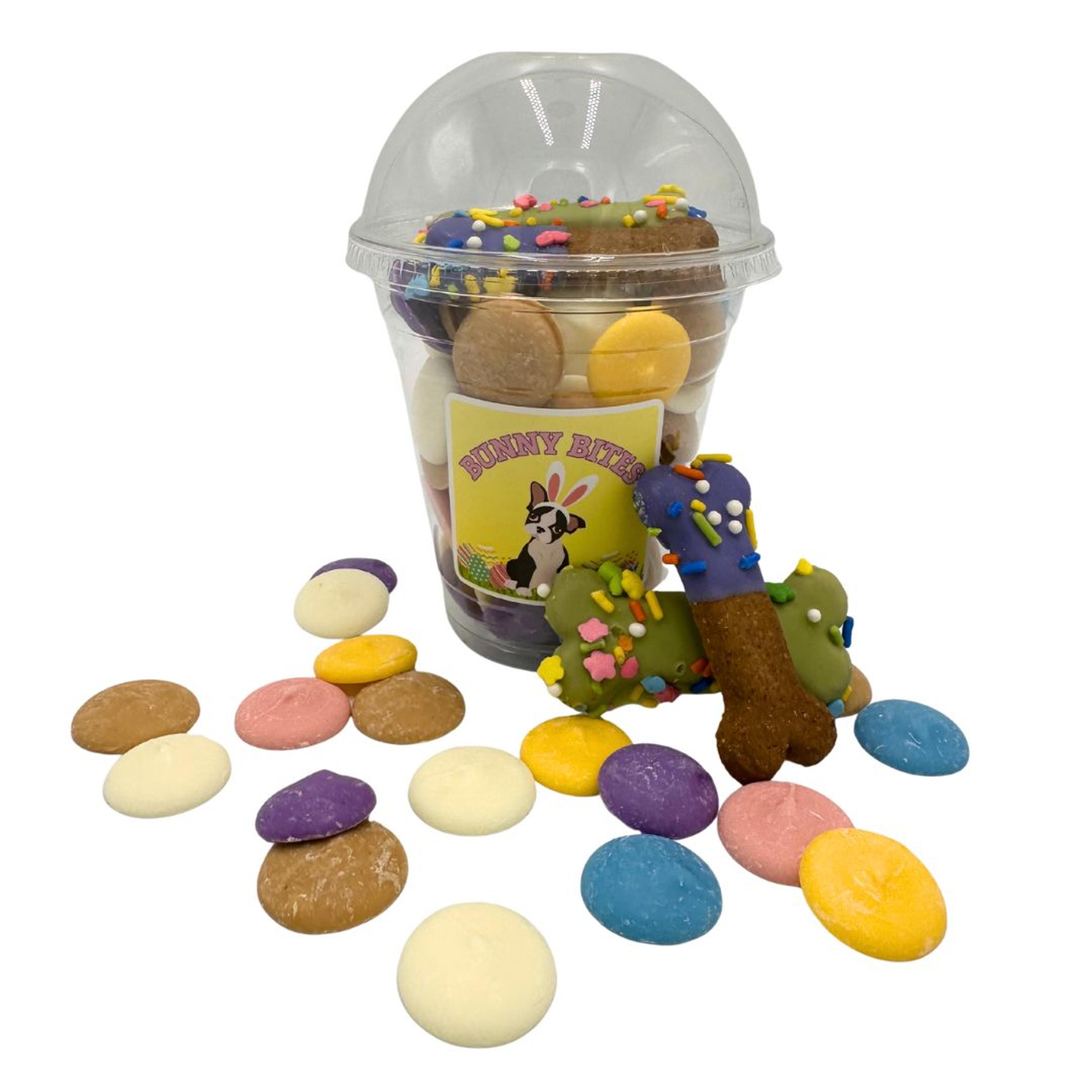 Festive and yummy treats from Two Bostons contain classic peanut butter and yogurt puppy kisses topped off with one hand decorated easter egg cookie. Adorable basket stuffer your dog will love! Net wt 9 oz.