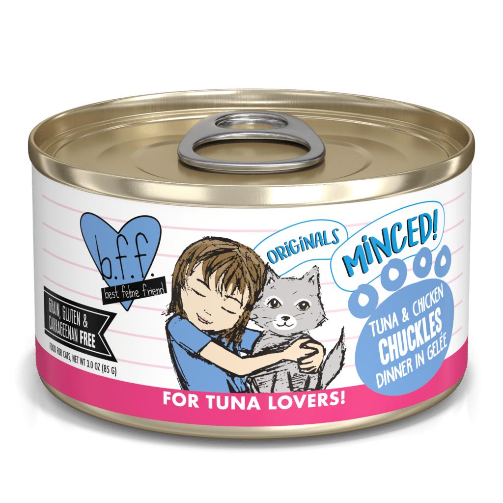 Your cat will be too busy enjoying its food to have time for chuckling! This combination will have your cat chasing after you for more. This 3 oz canned cat food from Best Feline Friend is made with meat fit for human consumption and your cat will appreciate it. Tuna and Chicken Chuckles also meets nutritional levels established by the AAFCO Nutrient Profiles for Adult Maintenance. This canned cat food is also grain free! Refrigerate after opening.
