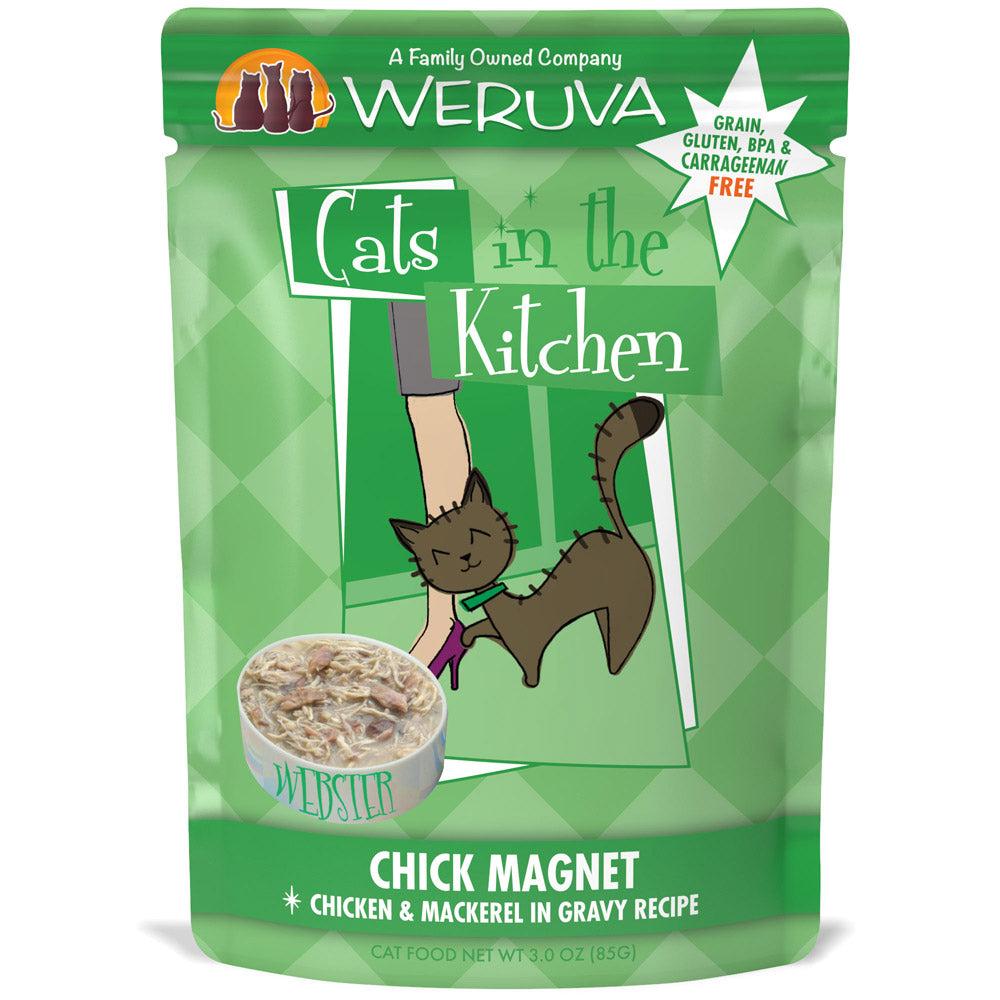 Your fine feline is sure to feel like a chick magnet after chowing down on this cat food! Weruva Cats in the Kitchen Chick Magnet contains a flavorful amount of chicken and mackerel submerged in gravy! This formula is grain and BPA free. You'll be able to hear your cat purring in excitement when this pouch is opened! Weruva Cats in the Kitchen Chick Magnet's pouch keeps in the moisture and water which is great for cats with UTI's and kidney issues. Plus it's much easier to open than those metal cans! So get your cat to lickin' with the Weruva Cats in the Kitchen Pumpkin Chick Magnet! 3 Oz Pouch