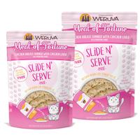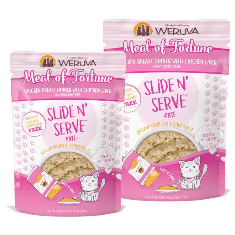 Your kitty is always a winner when they spin Weruva's Meal of Fortune! This yummy pate is packed with cage-free chicken breast and chicken liver, as well as plenty of moisture to keep your cat healthy and hydrated. Every meal is made completely from human-grade ingredients in human-grade kitchens, because Weruva knows your kitty deserves the best! If you're looking for fillers, grains, or carrageenan, then you'll have to buy a vowel because there are none on the board (or in the easy-to-open slide 'n serve pouches!). Available in 2.8 oz and 5.8 oz pouches.