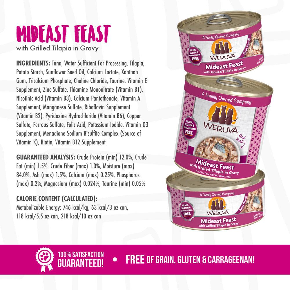 Magnificently Mideastern! This feast is for the fanciest of felines! The Mideast Feast for cats is fresh harvested tilapia that your cat will love! For the grain sensitive cat this canned cat food from Weruva is even grain free!